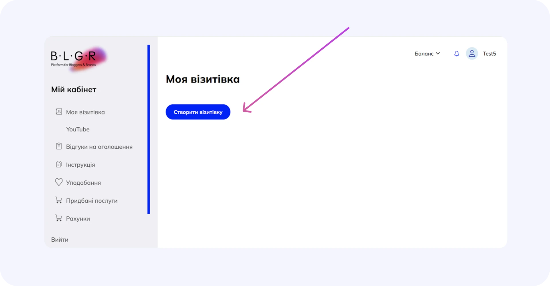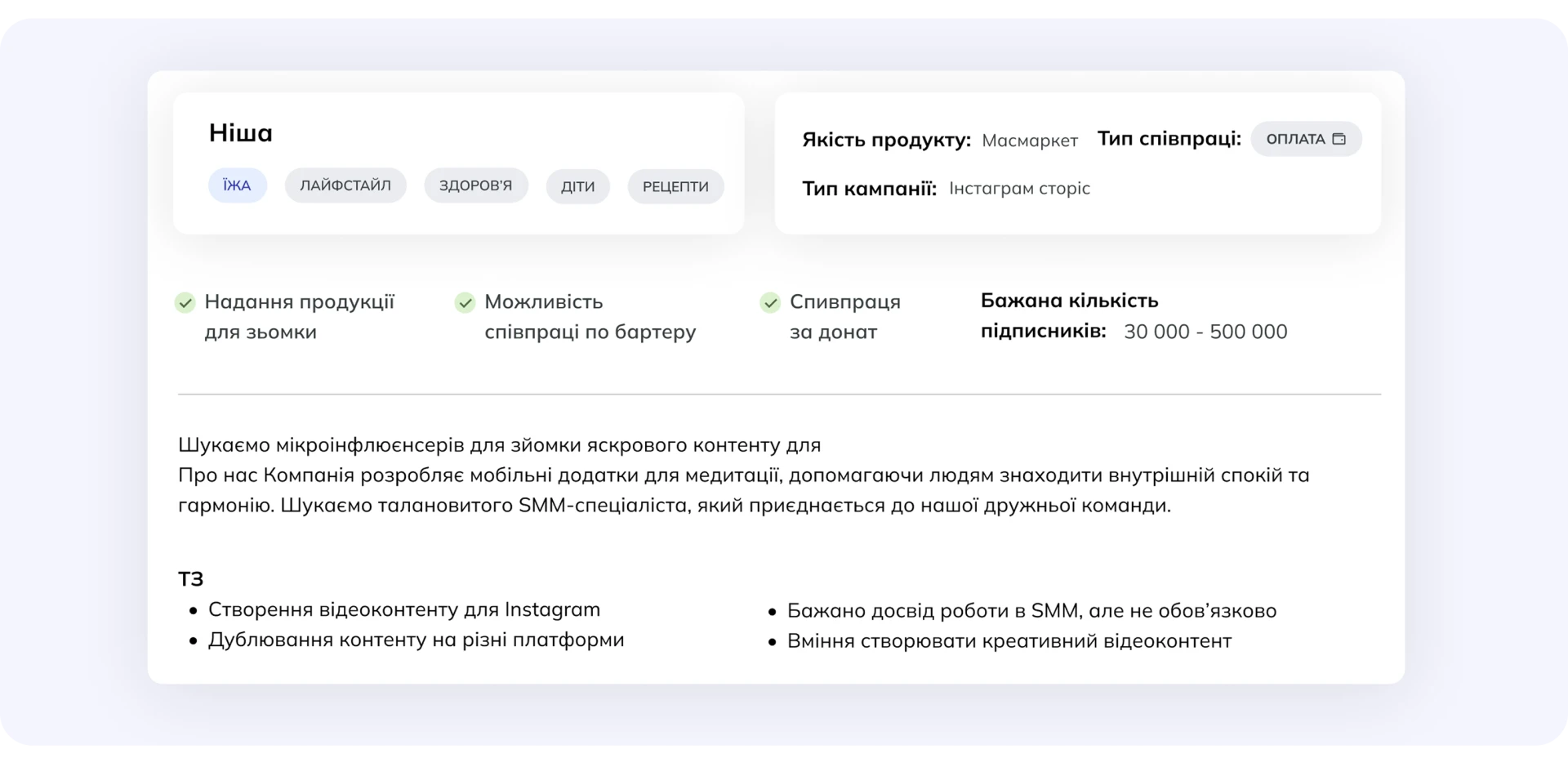 Після простої реєстрації та підтвердження email ви зможете створити деталізований профіль, який стане вашою візитною карткою. Створити свою візитку можна безплатно! У ній виберіть соціальну мережу, де ви є експертом. А якщо у вас їх кілька, то можете створити під кожну з них окрему візитку. Далі опишіть тематику контенту, розкажіть про аудиторію та умови співпраці — чим повніша інформація, тим вищі шанси, що вас помітять ідеально відповідні бренди.