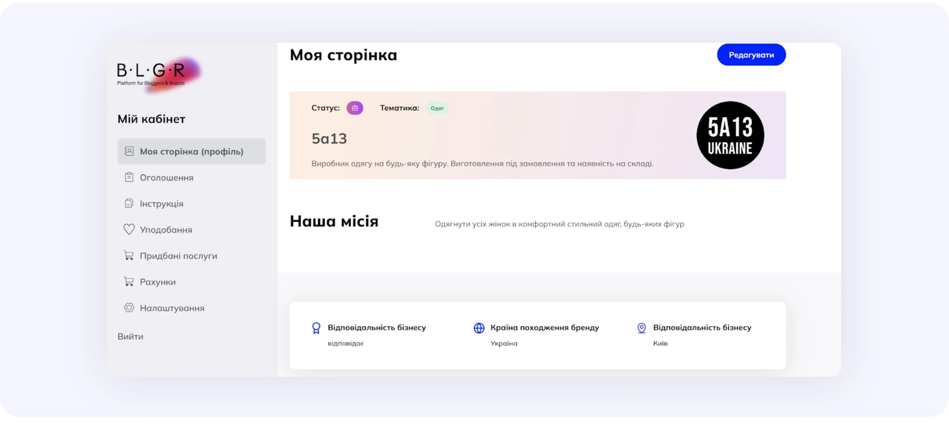 Тепер ви можете створити докладний профіль бренду — це ваша візитна картка для блогерів. Чим повніше й цікавіше ви розповісте про себе, тим вищі шанси, що на ваші пропозиції відгукнуться топові інфлюенсери. Вкажіть сферу діяльності, опишіть свою цільову аудиторію, додайте посилання на соцмережі — хай блогери розуміють, з ким їм доведеться співпрацювати.