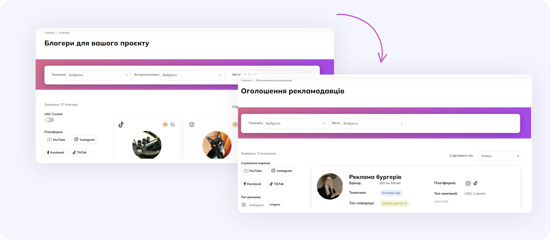 Для взаємодії з інфлюенсерами ви можете розміщувати свої оголошення про співпрацю та чекати на відгуки від зацікавлених блогерів або самостійно шукати авторів через зручну систему фільтрів. З її допомогою можна підібрати блогерів за тематикою, геолокацією, кількістю передплатників та іншими важливими параметрами.