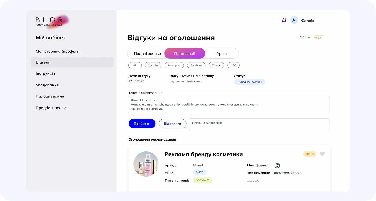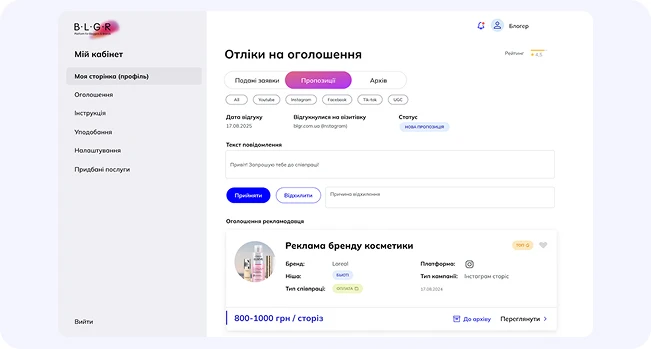 Отримувати або надсилати пропозиції щодо співпраці блогерам.