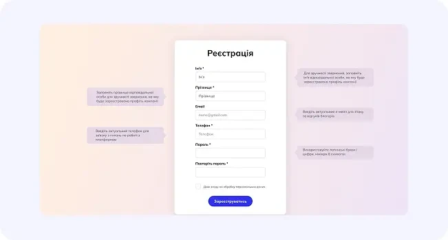 - Прізвище - заповніть прізвище відповідальної особи для зручності звернення, на яку буде зареєстровано профіль компанії;