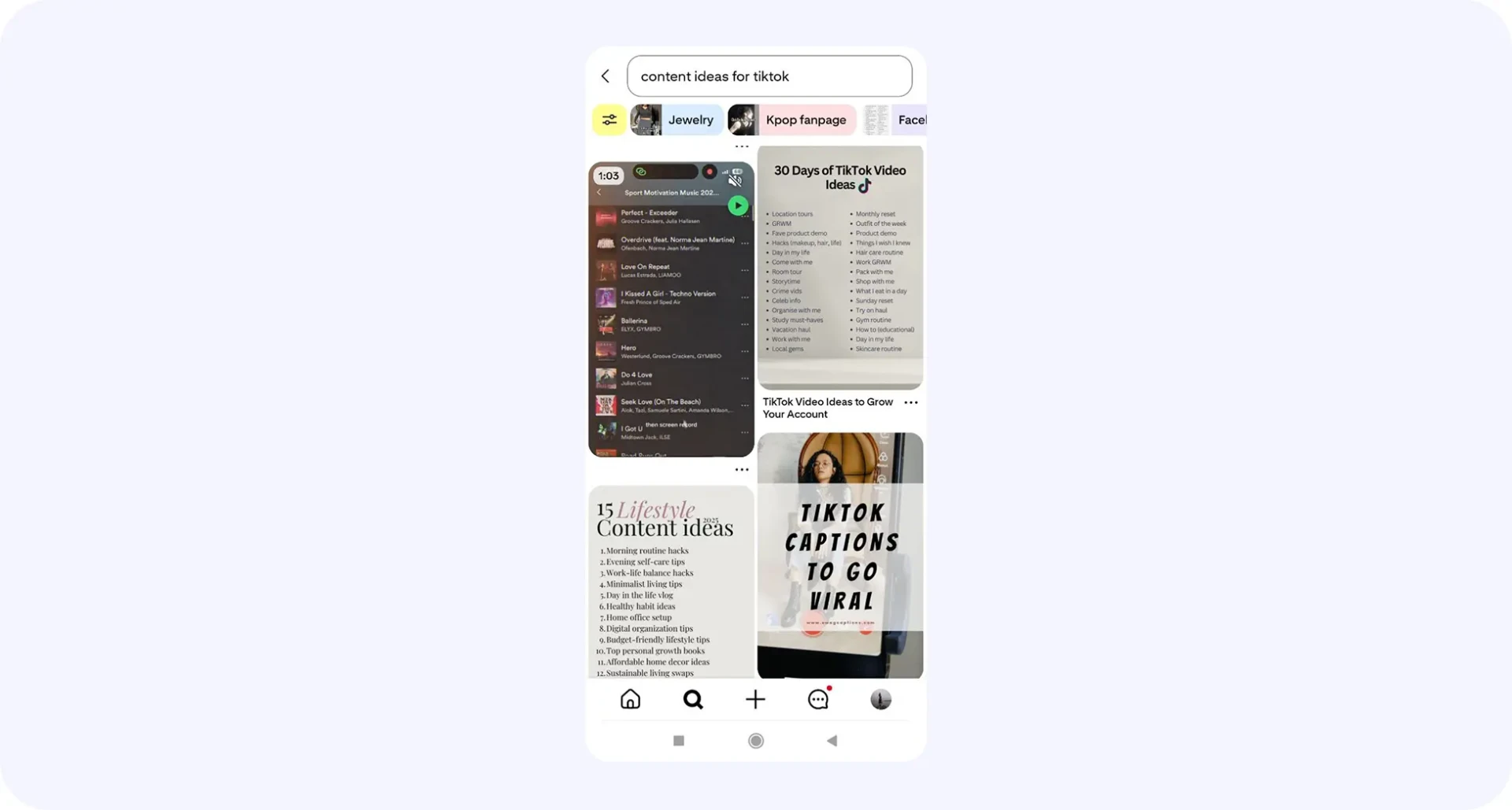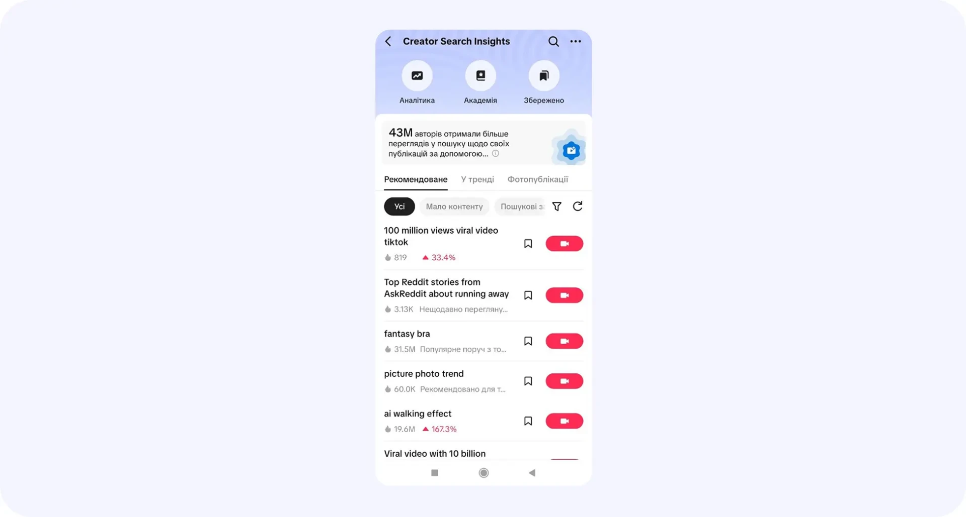 Достаточно ввести ключевое слово и TikTok покажет, какие видео получают больше просмотров, лайков и удержания внимания. Можно проанализировать, что работает: начало ролика, музыка, продолжительность или структура истории.